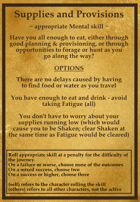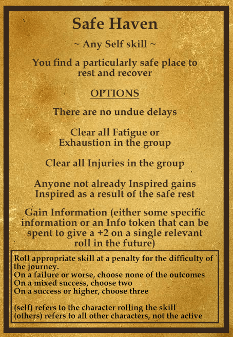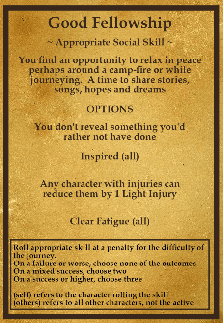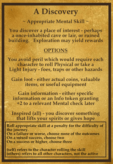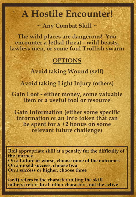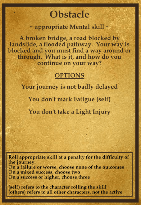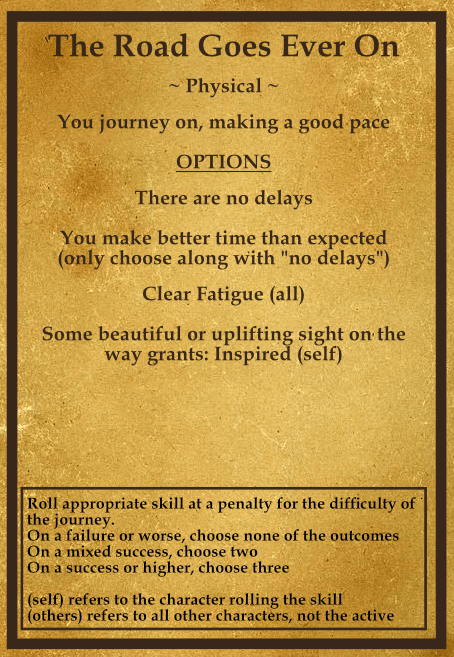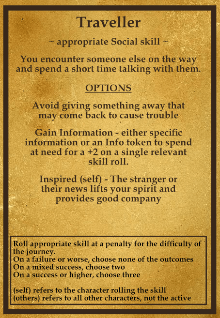 My idea is that a number of cards are drawn, one at a time, the number depending on the length of the journey. One character will be responsible for leading the group’s response to the situation on the card, with the outcome of their roll determining what happens to them and the group. The situation can be skimmed over with those bare rules, or roleplayed around as much as the group desires. Once that’s dealt with, the next card is drawn, and so on.