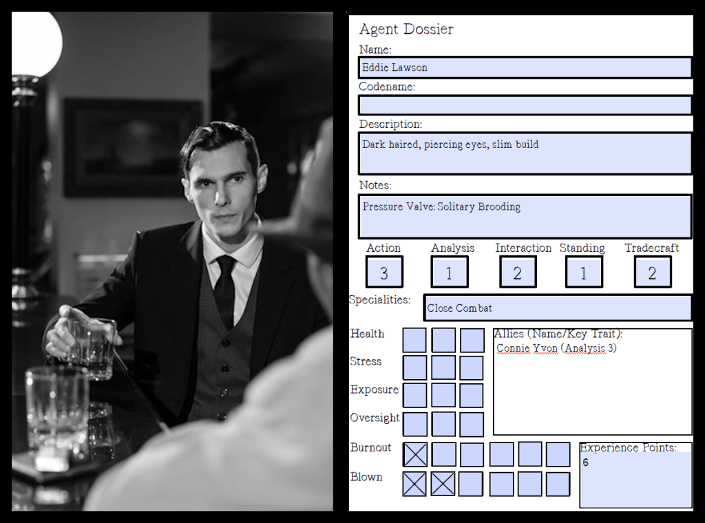 Connie’s roll is a 5 – a full success and he gets Connie’s aid later if needed. He marks Complexity box 7 and returns covertly to East Berlin fully briefed on the potential risks from Stasi agents.