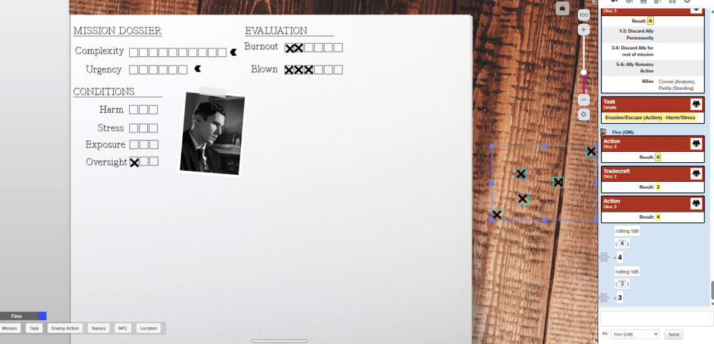 Roll: 4 – Mixed Success – He gets away but I’m going to mark 1 Harm (a graze from a gunshot) and 1 Exposure (the enemy clearly knew much more about him and his plans than he’d thought). Normally a Failure would result only in marking one Condition and ticking up the Urgency track – since there is no Urgency track anymore due to this being the final act of the mission, I think it’s fair to inflict a second Condition.