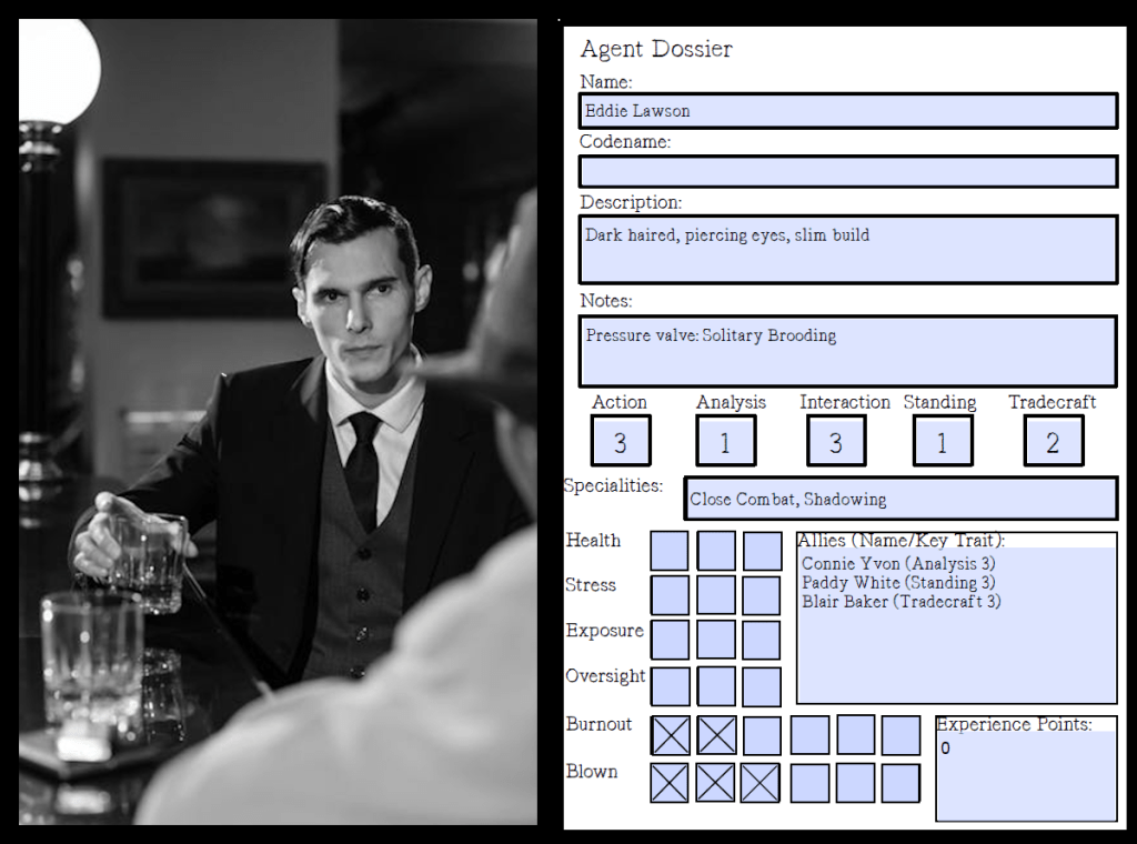 Eddie spends 3 of his EP to take on a new Ally – a newly recruited Scalphunter called Blair Baker – she’s fresh from the training school and specialises in Tradecraft.