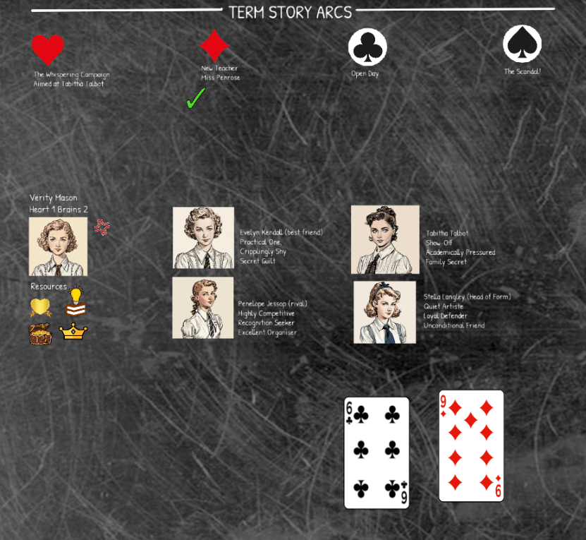 That first Brains Challenge looks tough – Verity will spend a Knowledge Asset to pick out some historical details from her knowledge of the school that can be used at the Open Day without turning the whole school upside down. Spending the Asset gives Advantage on the draw, so two cards drawn and taking the best… 10 of Diamonds (we’ll take this one) and a 3 of Hearts. The Ten of Diamonds plus the 2 Brains that Verity has is a success and since the suit matches the Challenge type it’s an exceptional success. I’ll use it to get rid of Verity’s lingering Distress.