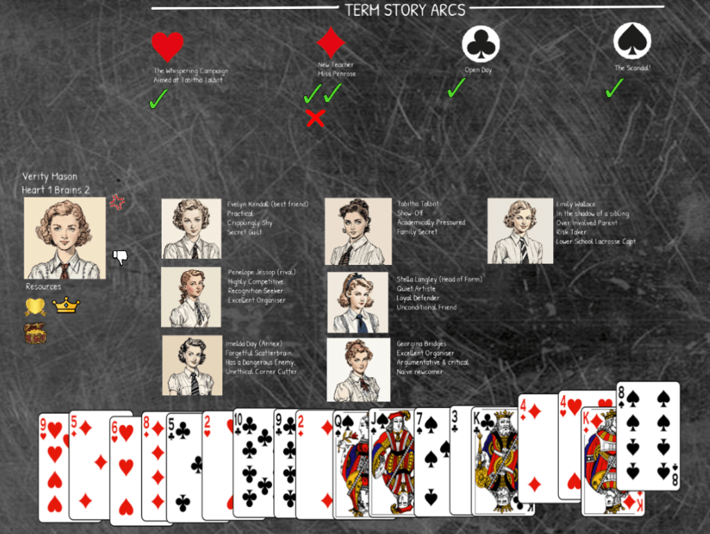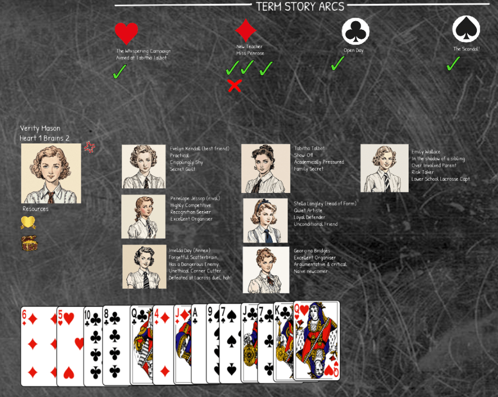 Next Scene… the draw is a 7 of Spades – a new Arc and with a Friend. Since all the Arcs are in play, I’ll choose a non-current one. The last one was Whispering Campaign, so I’ll go back to the New Teacher Arc and see how Miss Penrose’s dreary influence is spreading. Starting with a Yes/No Oracle question… has Miss Penrose’s clique grown? I’ll make that Likely – and the draw is Jack of Clubs – YES/AND…