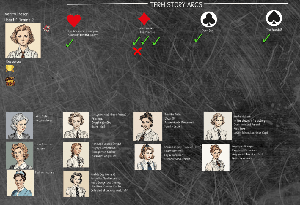 That would be a routine Mischief check… she draws 5 of Hearts – ouch. Who sees her? It’s not likely to be Miss Penrose as she was heading out, so we’ll start with “Is it a Pupil (rather than a teacher)?” (Evens) – Ace of Hearts – YES/AND…