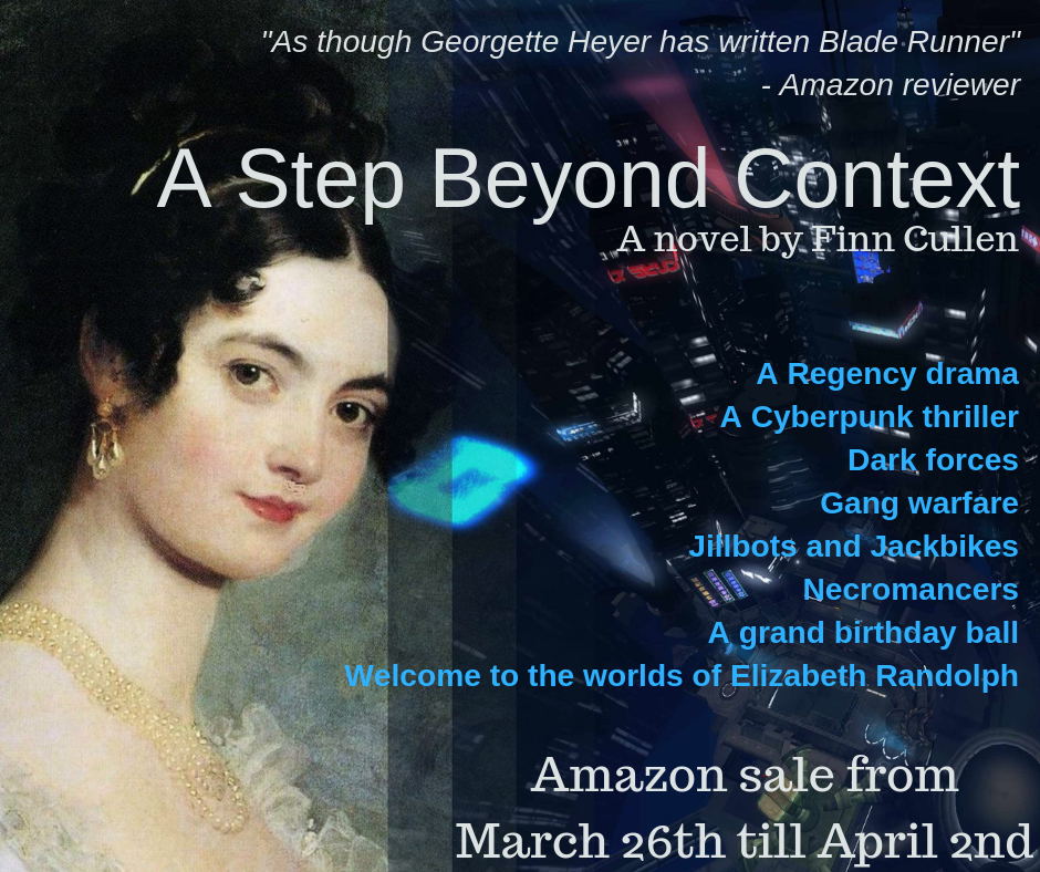 Finn’s first novel A Step Beyond Context is available on Amazon.co.uk and Amazon.com and a few others as well. It’s a punchy genre-busting mystery with a heroine who is a Regency lady, a high tech mercenary and much more.